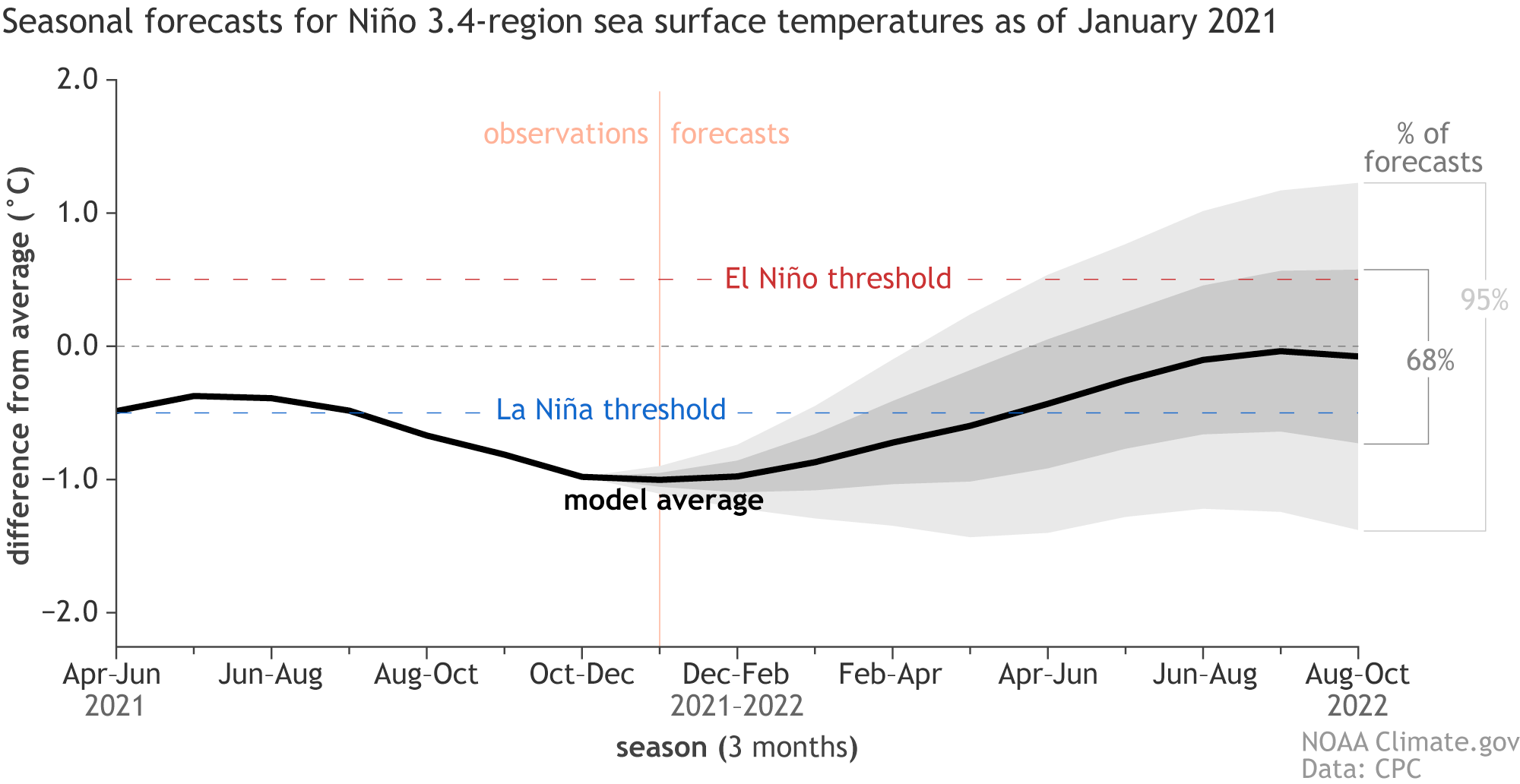 Climate model forecasts for the Niño-3.4 temperature anomalies in 2022. Average dynamical model data (black line) from the North American Multi-Model Ensemble (NMME): darker gray envelope shows the range of 68% of all model forecasts; lighter gray shows the range of 95% of all model forecasts. NOAA Climate.gov image from University of Miami data.