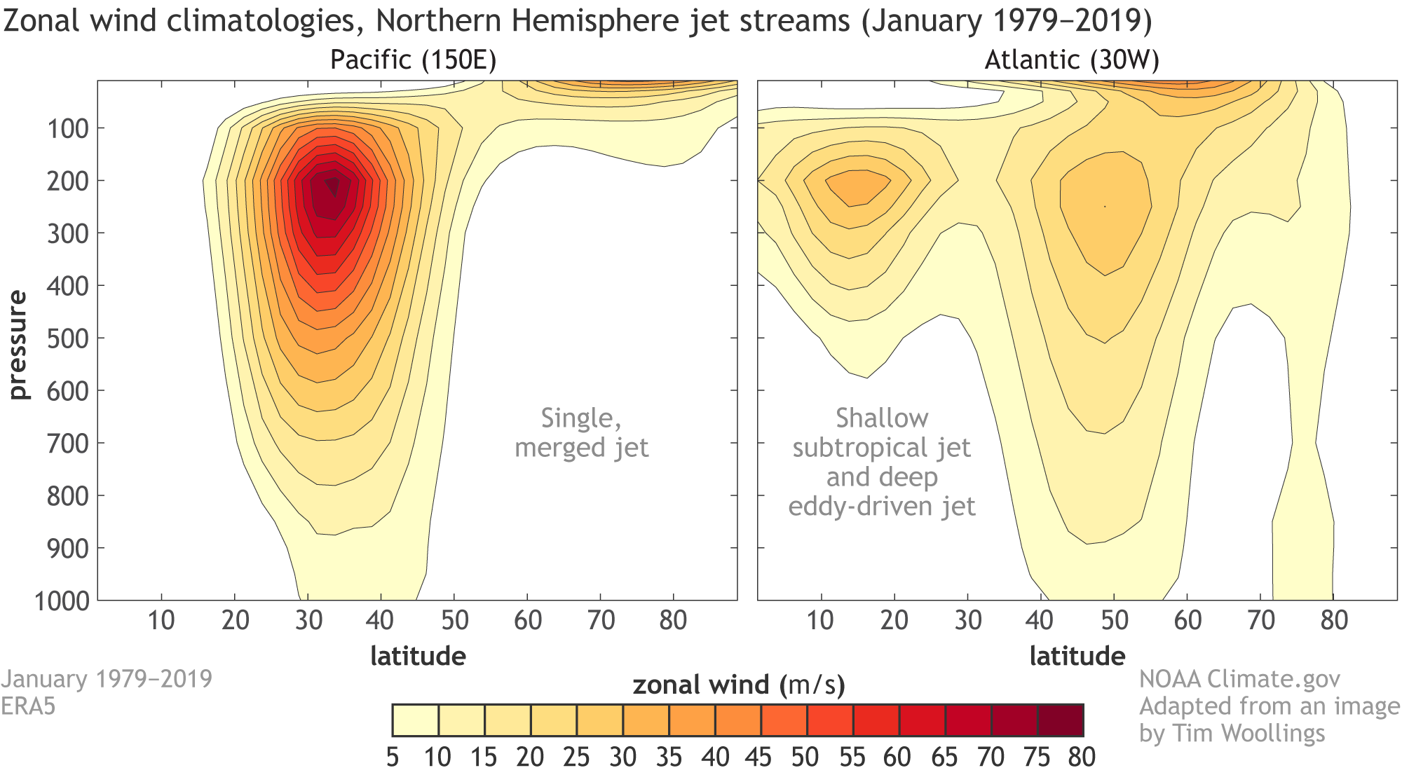 The jet streams or average zonal wind (in meters per second) over a cross-section of the Pacific Ocean (left panel) and Atlantic Ocean (right panel). The x-axis shows the latitude in the Northern Hemisphere with the equator on the left and North Pole on the right. The y-axis is the pressure level oriented with the surface on the bottom and the top indicating the top of the atmosphere. Data is based on ERA5 using a 1979-2019 climatology. Image courtesy of Tim Woollings and modified by Climate.gov.