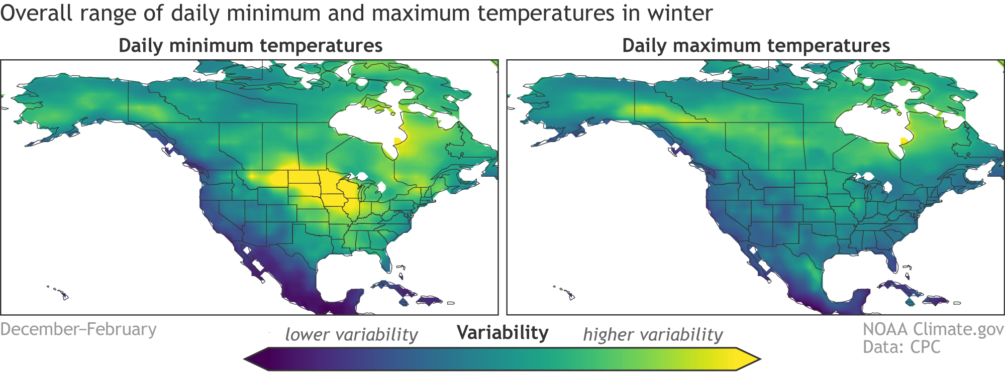 The average variability of daily low temperatures (left) and high temperatures (right) within winter. Yellow regions show where the range of daily temperatures in winter is greatest, while blue shows regions with the narrowest range. The range is assessed using the standard deviation of daily low or high temperature averaged over all winters (December–February), 1950–2020. Daily temperature data source is Berkeley Earth. Map by climate.gov based on analysis by Emily Becker.