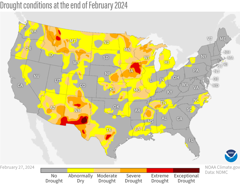 Drought conditions across the contiguous United States as of February 27, 2024. Only a few parts of the country were still experiencing extreme (red) or exceptional (dark red) drought. NOAA Climate.gov map, based on data from the U.S. Drought Monitor Project. For more on drought, visit Drought.gov.