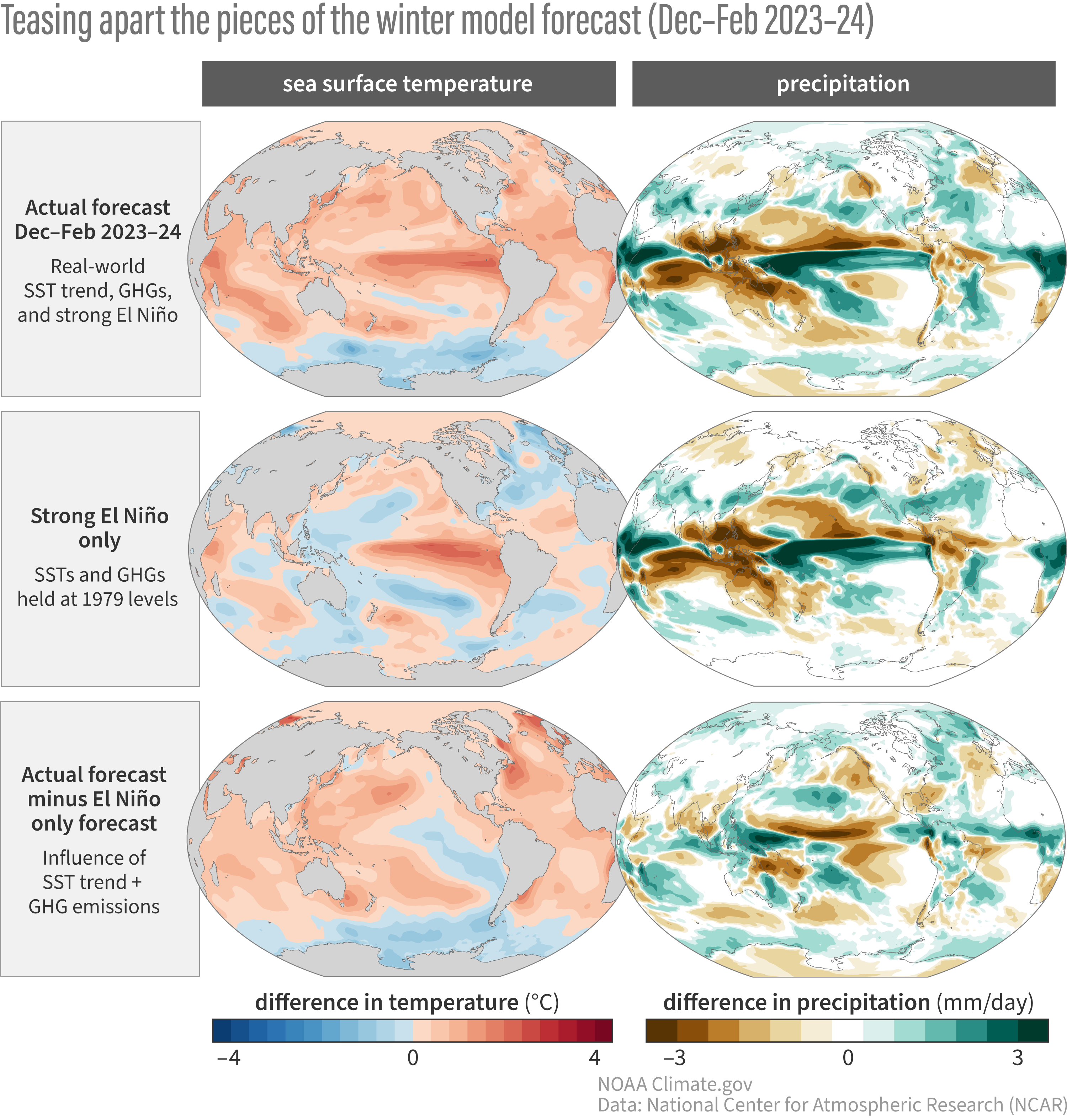 Predicted (left column) Sea surface temperature (SST) anomalies and (right column) precipitation anomalies for December-February 2023-24 from the SMYLE forecast system (see footnotes for details). The top row shows the forecast with all factors included (SST trends, greenhouse gas (GHG) emissions, El Niño), the middle row shows the part of the forecast related to El Niño-only (no SST trend and GHG held at 1979 levels), and the bottom row shows the portion of the forecast attributable to the influence of the SST trend + emissions. In the SST panels, red shading indicates above-average SSTs and blue shading shows below-average SSTs. In the precipitation panels, green shading is above-average precipitation and brown shading indicates below-average precipitation. Anomalies relative to the 1979-2019 average. Figure credit: Adam Phillips, NCAR, with modifications by climate.gov.