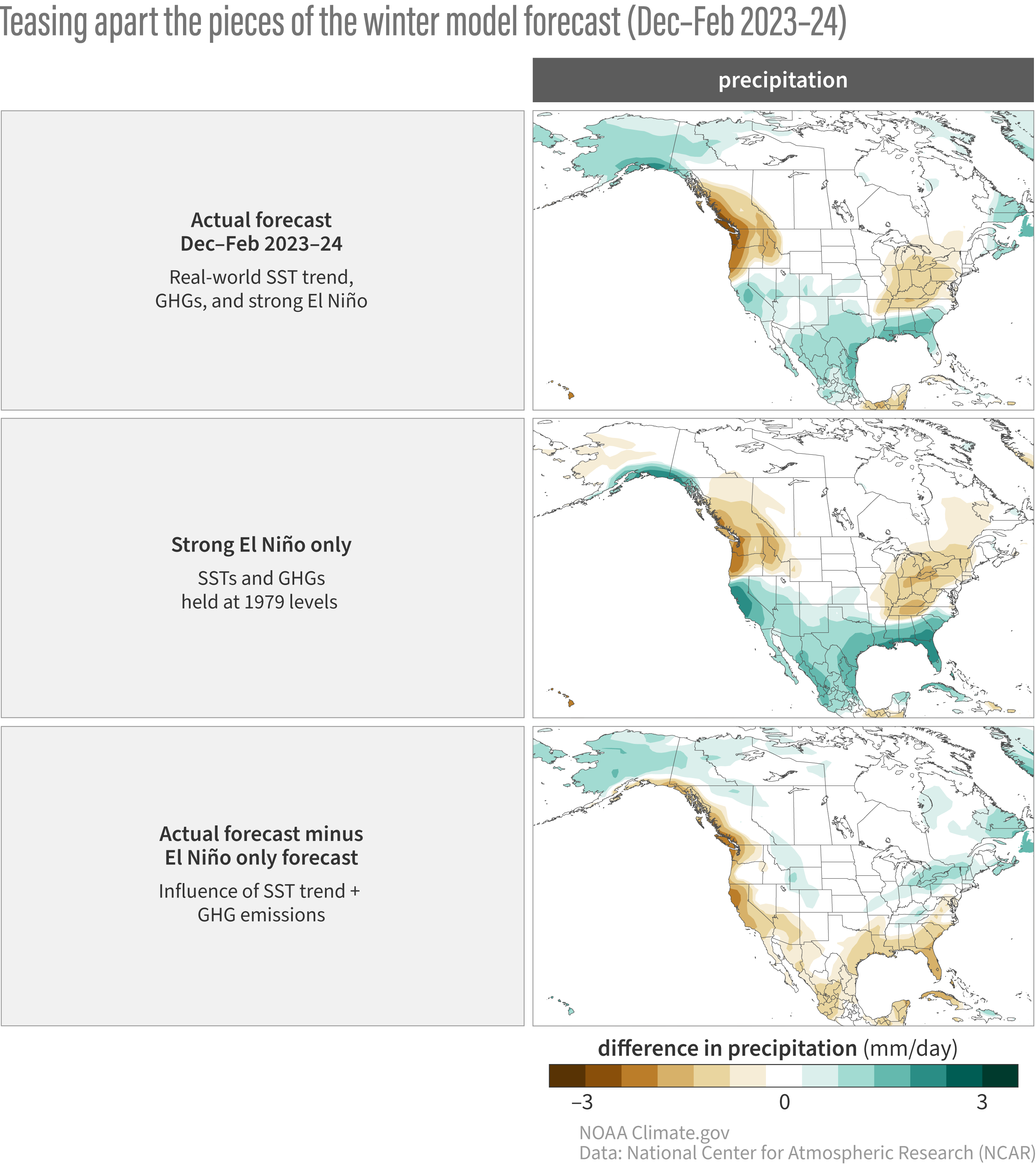 Predicted North America precipitation anomalies for December-February 2023-24 from the SMYLE forecast system (see footnotes for details). The top panel shows the forecast with all factors included (SST trends, greenhouse gas (GHG) emissions, El Niño), the middle panel shows the part of the forecast related to El Niño-only (no SST trend and GHG held at 1979 levels), and the bottom panel shows the portion of the forecast attributable to the influence of the SST trend + emissions. Green shading is above-average precipitation and brown shading indicates below-average precipitation. Anomalies relative to the 1979-2019 average. Figure credit: Adam Phillips, NCAR, with modifications by climate.gov.