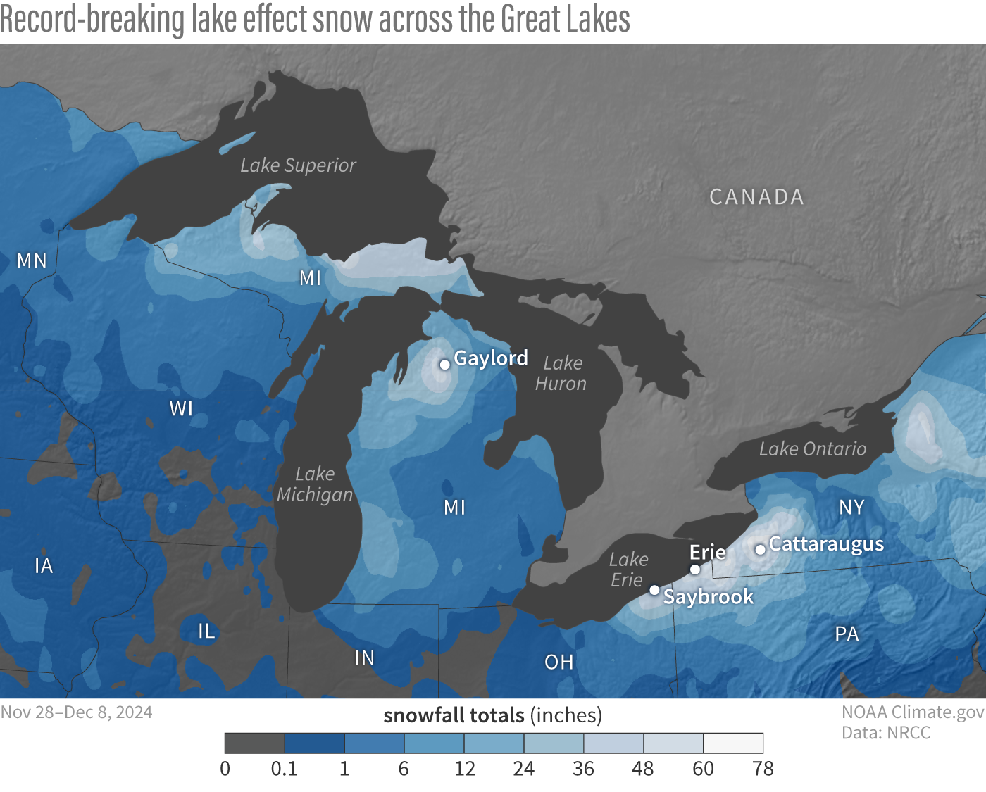 Snowfall totals across the Great Lakes from November 28 to December 8, 2024. The heaviest snowfall is depicted in white while lower totals are in various shades of blue. Any snowfall that was between zero but less than measurable (or 0.1 inches) is in dark gray. Note: There is no snowfall data for Canada included on this map. NOAA Climate.gov image based on data from the Northeast Regional Climate Center.