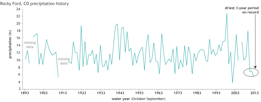 Precipitation in Rocky Ford, Colorado, for "water years"—October-September periods—since 1893. Although precipitation in 2002 was also quite low, the past three years are the driest consecutive 3-year period on record. Graph by NOAA.Climate.gov, based on data provided by Wendy Ryan.
