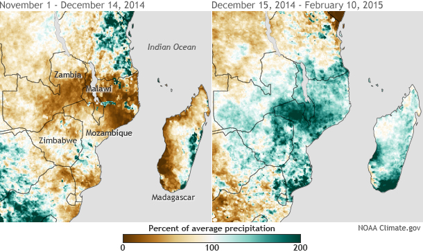 Percent of normal rainfall for southern Africa from November 1–December 14, 2014 (left) and December 15-February 10, 2015 (right). The monsoon season produced very little rain early in the season, but then unleashed a deluge. Map by NOAA Climate.gov based on CPC’s African Rainfall Climatology (ARC). ARC’s historical record dates back to 1983.